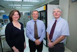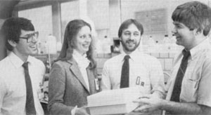 ![]() Picture from 1985 of Abbott scientists with the first HIV test kit, the Abbott HTLV-III. (From left to right) Scott Webber, Robin Gutierrez, George Dawson, John Heller. | ![]() Picture of three of the scientists today: Robin Gutierrez, George Dawson, John Heller (retired). |